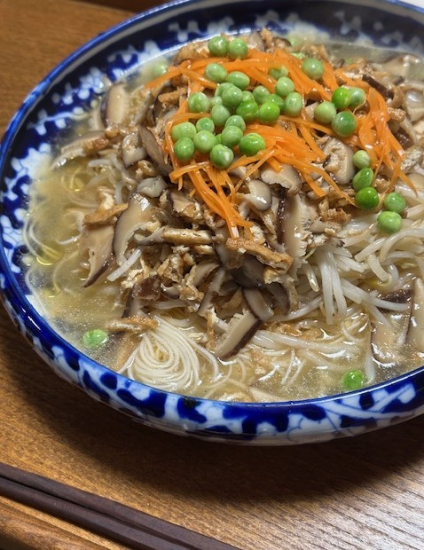 興福寺の普茶料理の一品 メインディッシュの素麺は「黄檗素麺」といいます もともとはビーフンで作っていたいものを、 先代住職が、長崎には美味しい島原素麺があるのだからと、素麺を使ってお出ししています 椎茸や人参、薄揚げ、グリンピースなどに たっぷりのごま油でいただきます