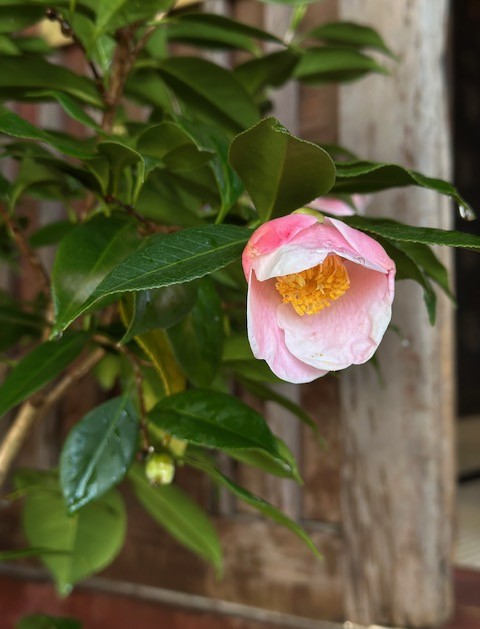まるでビロードを纏っているかのような風情の薄桃色の椿・西王母です。