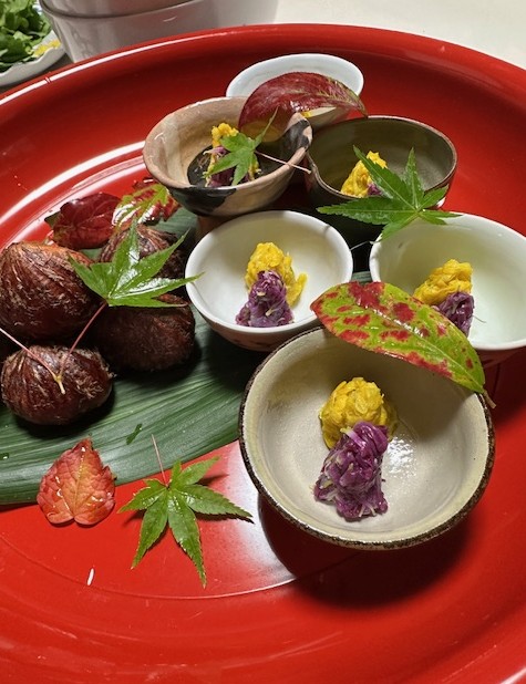 この時期ならではの「もってのほか」 菊花のおひたしです 黄色と紫の菊は、天皇家の紋章です。 それをいただくのですから「もってのほか」と銘がついています きょうは もってのほかと 揚げ栗です
